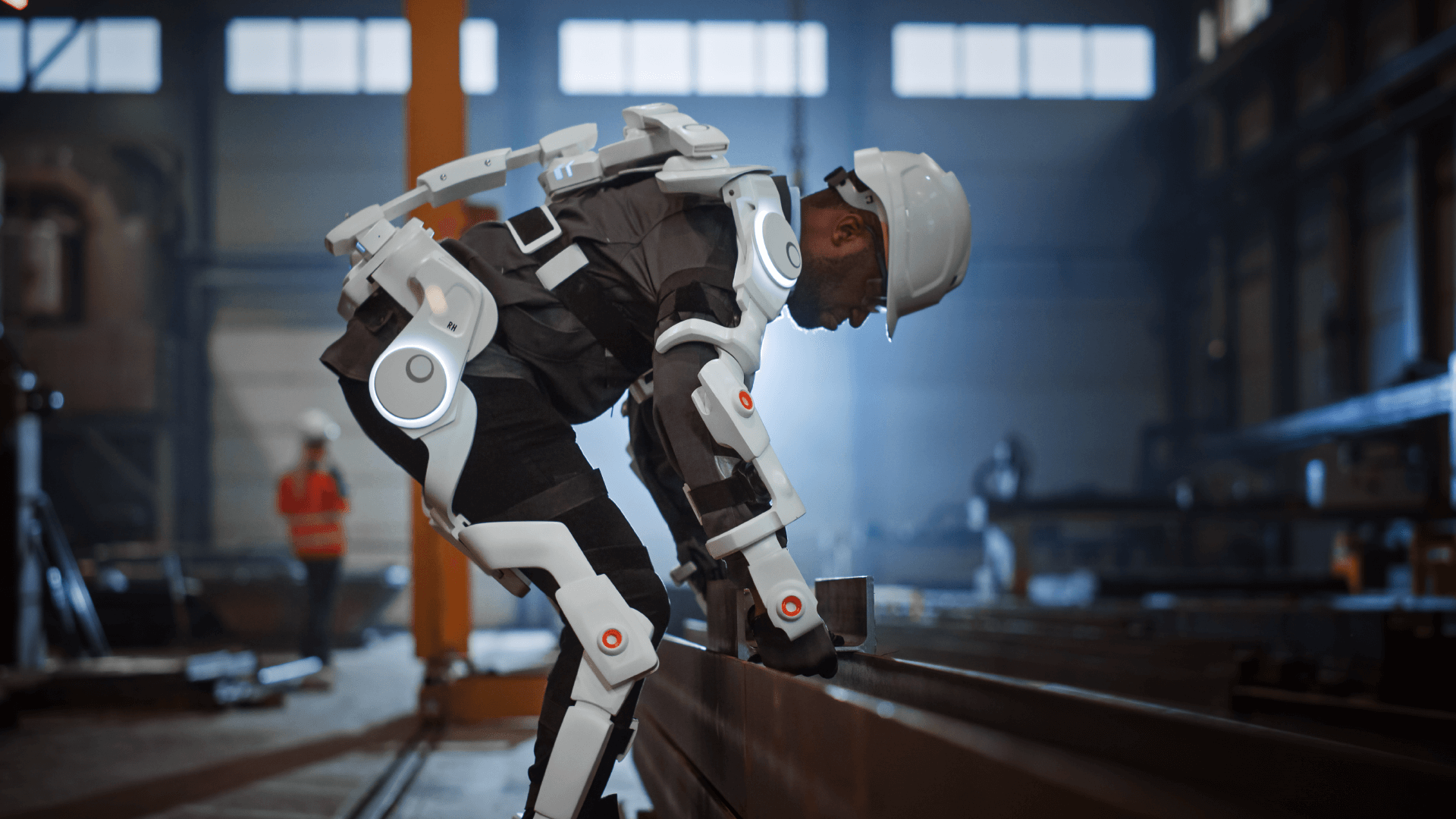 Ein Exoskelett unterstützt und entlastet Mitarbeiter im Lager bei schweren körperlichen Tätigkeiten.