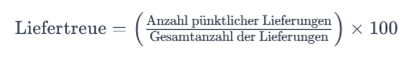 Die Berechnung erfolgt also, indem man die Anzahl der erfolgreich pünktlich gelieferten Produkte durch die Gesamtanzahl der Lieferungen teilt und das Ergebnis mit 100 multipliziert, um den Prozentsatz zu erhalten.