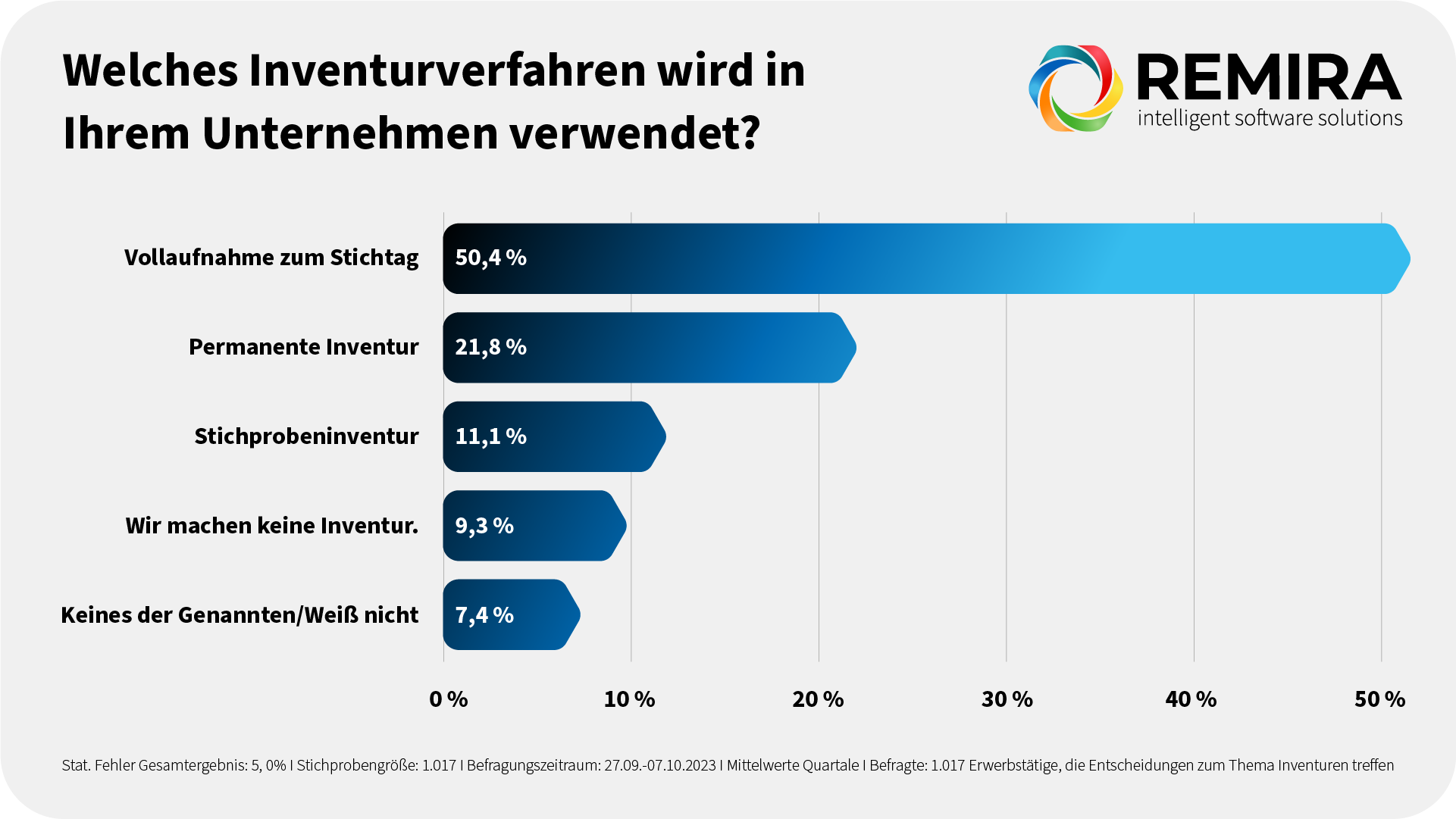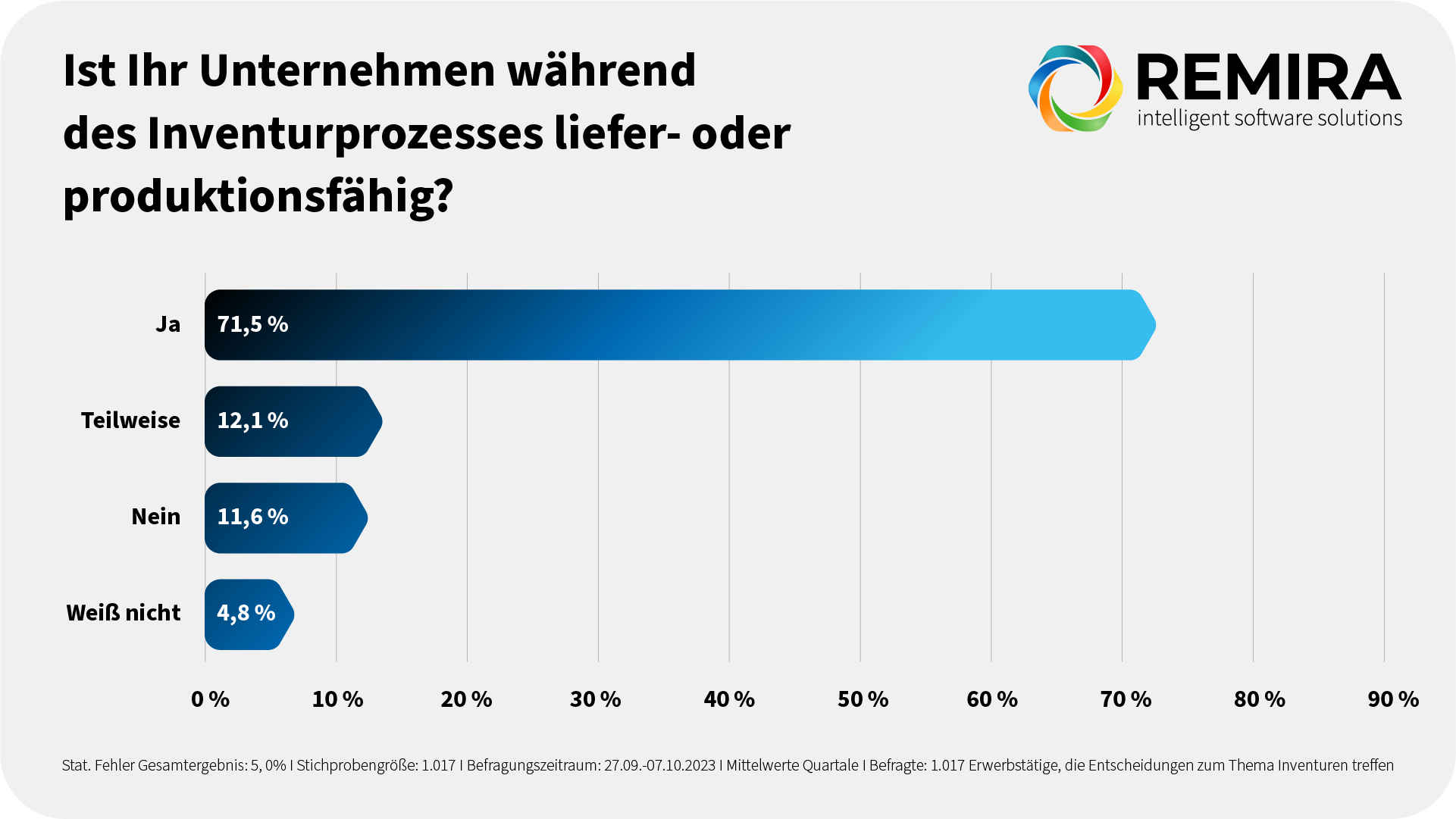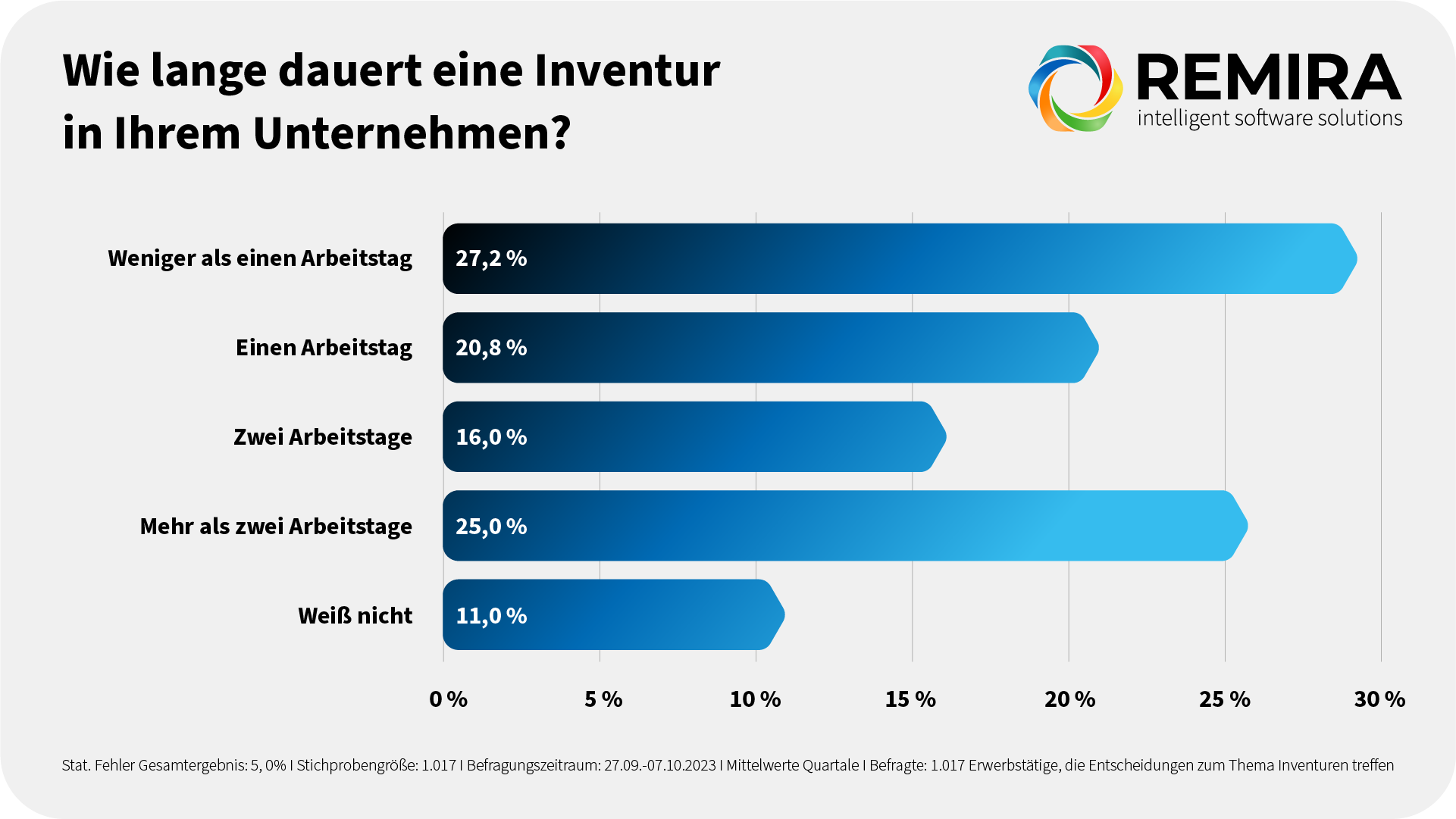 An der Umfrage der Berliner Markt- und Meinungsforscher haben mehr als 1.000 Erwerbstätige teilgenommen, die für die Durchführung von Inventuren in ihren Unternehmen verantwortlich sind. Auftraggeber war der Dortmunder Softwareanbieter REMIRA. Bei der Auswertung zeigte sich, dass rund 70 % der Befragten noch immer eine zeitaufwendige Vollaufnahme der Warenbestände zum Stichtag oder eine permanente Inventur durchführen. In mehr als 40 % der Firmen beträgt der Zeitaufwand für die jährliche Inventur zwei oder mehr Arbeitstage. Üblicherweise sind hieran mehrere Arbeitskräfte oder sogar das komplette Team beteiligt. Das hat unmittelbare Auswirkungen auf die Liefer- und Produktionsfähigkeit: Mehr als jedes zehnte Unternehmen ist laut eigener Aussage während der Inventur gar nicht liefer- und produktionsfähig. Weitere 12 % der Befragten gaben an, in dieser Zeit nur teilweise einsatz- und lieferbereit zu sein.