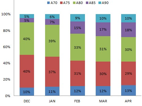 In the example above you will recognize a standard size pack logic of the December delivery. This is the sell-in of the forward orders or first allocation to the different shops. Question arises here; “Did we miss opportunity to sell size A85 in December and January?”. This of course depends on the over-availability on sizes at load-in and if there is an opportunity to do additional buys.